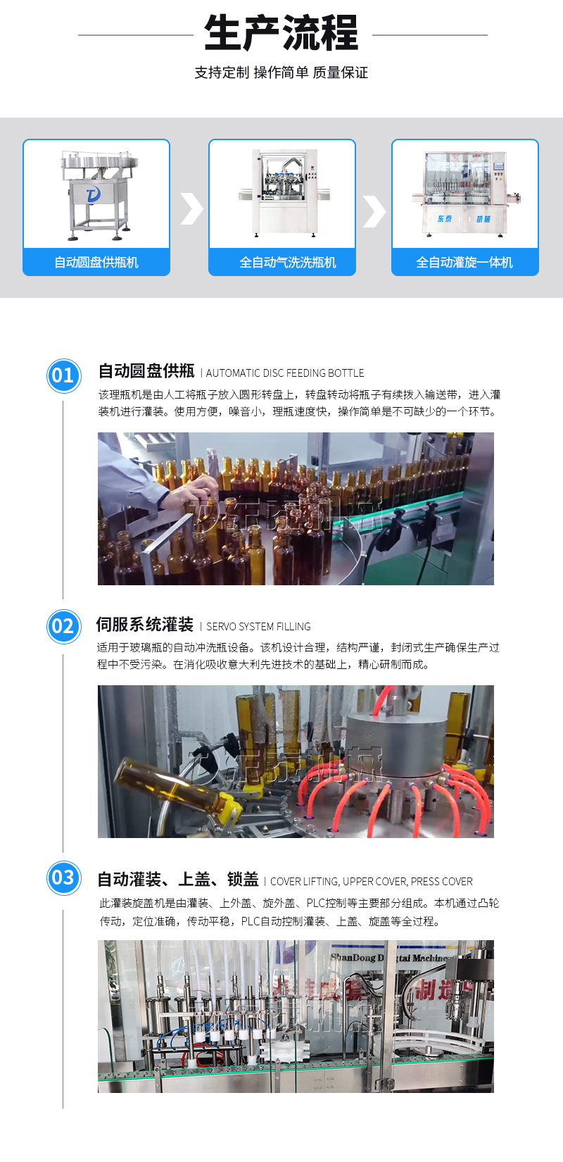此橄欖油灌裝旋蓋機(jī)生產(chǎn)線是由灌裝、上外蓋、旋外蓋、PLC控制等主要部分組成。本機(jī)通過凸輪傳動,定位準(zhǔn)確,傳動平穩(wěn),PLC自動控制灌裝、上蓋、旋蓋等全過程。并可配置全自動注塑機(jī),由吹瓶直接進(jìn)入灌裝系統(tǒng),防止交叉感染,整個過程全部在無菌條件下完成,無需洗瓶和烘干。此灌裝旋蓋機(jī)適合于食用油、藥品等粘流體的灌裝生產(chǎn)。